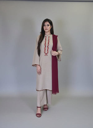 Designed for comfort and grace, this outfit features a soft beige shirt beautifully enhanced with intricate maroon embroidery on the neckline, adding a refined traditional touch. The subtle tassel detailing on the sleeves and hem gives it a delicate handcrafted feel, making it perfect for both casual and semi-formal occasions.