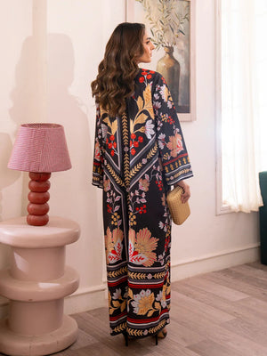Imagine the serene beauty of Nargis, a gracefully stitched 2-piece dress designed in a flowing kaftan style that exudes effortless charm. Crafted from Premium Swiss Lawn, it features a long-length printed shirt paired with a solid plain trouser, offering a combination of elegance, ease, and sophistication.