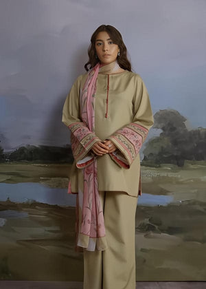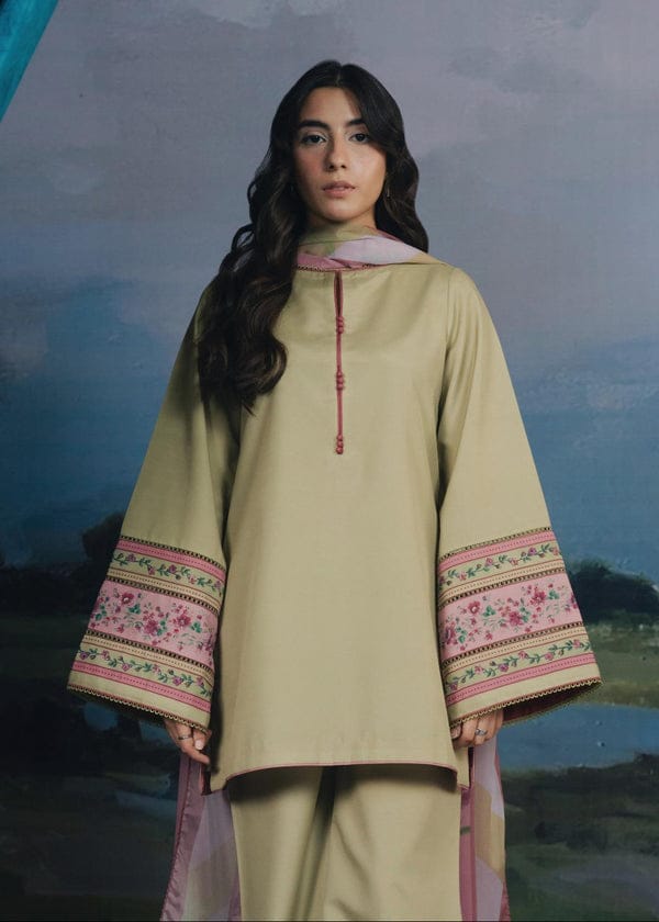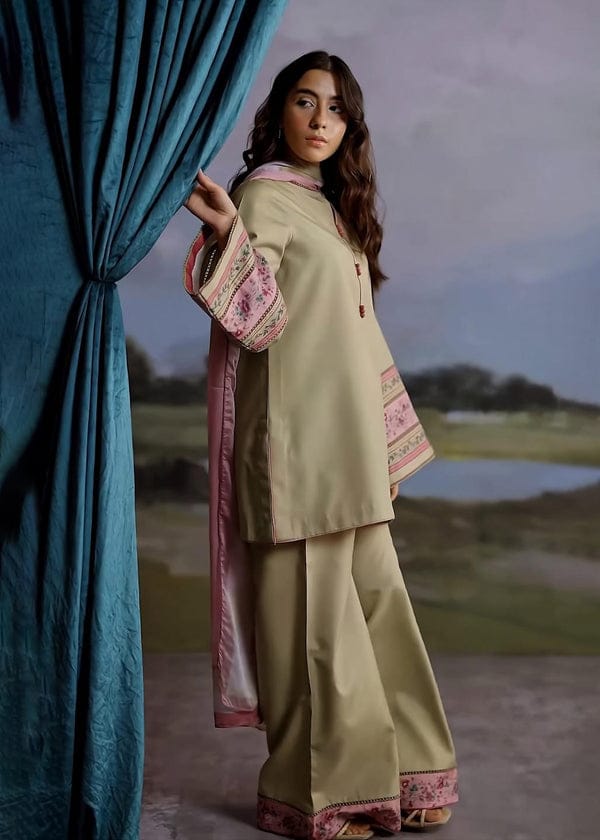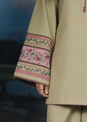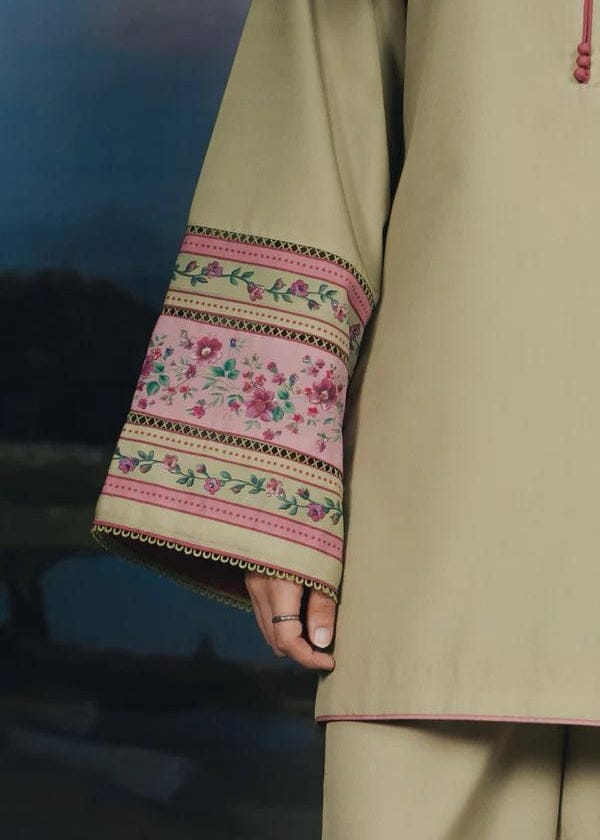 Designed in a soothing sage tone, the shirt features a relaxed, flowy silhouette that offers all-day comfort without compromising on style. The true highlight of this outfit is its stunning printed sleeves — adorned with delicate pink patterns and intricate motifs that add charm and a refined statement touch. The coordinated printed border on the trousers enhances the overall look with a beautifully balanced finish.