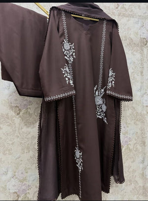 Turn heads with our captivating grey ensemble. Featuring intricate embroidery on the neckline, front and sleeves, paired with embroidered farshi shalwar. The look is elevated with a gracefully embroidered.